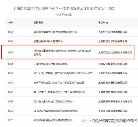 近期,上海市科学技术委员会组织的“上海市2022年度科技型中小企业技术创新资金计划”拟立项项目名单公示完毕,mksport官网生物“用于治疗重度哮喘的全新长效IL-5纳米抗体药物的临床前开发”项目入围。